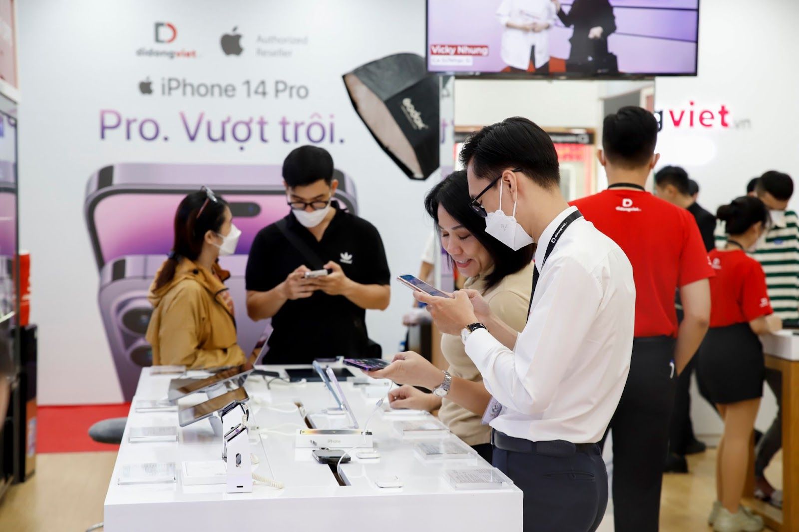 Ghi nhận tại hệ thống Di Động Việt, đại lý ủy quyền chính thức của Apple tại Việt Nam (AAR), Top 3 hệ thống có số lượng cửa hàng đạt chuẩn PPG được lên website của Apple nhiều nhất Việt Nam, không chỉ riêng đêm mở bán sớm mà ngay trong sáng 14.10, đã có rất đông khách hàng đến xếp hàng mua iPhone 14 series VN/A.