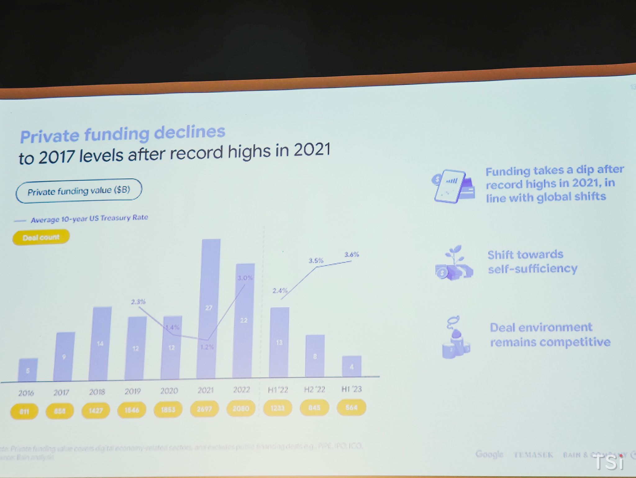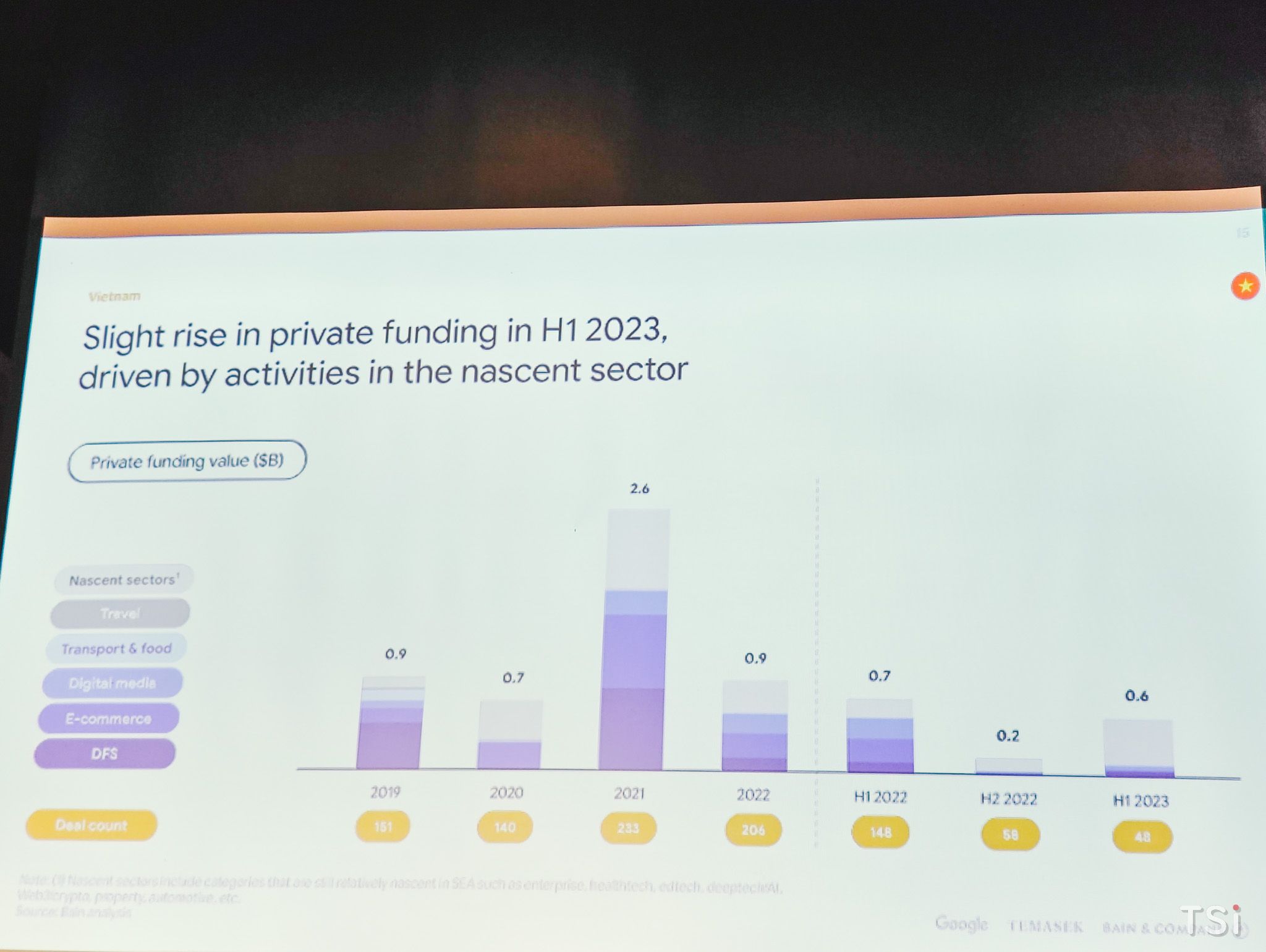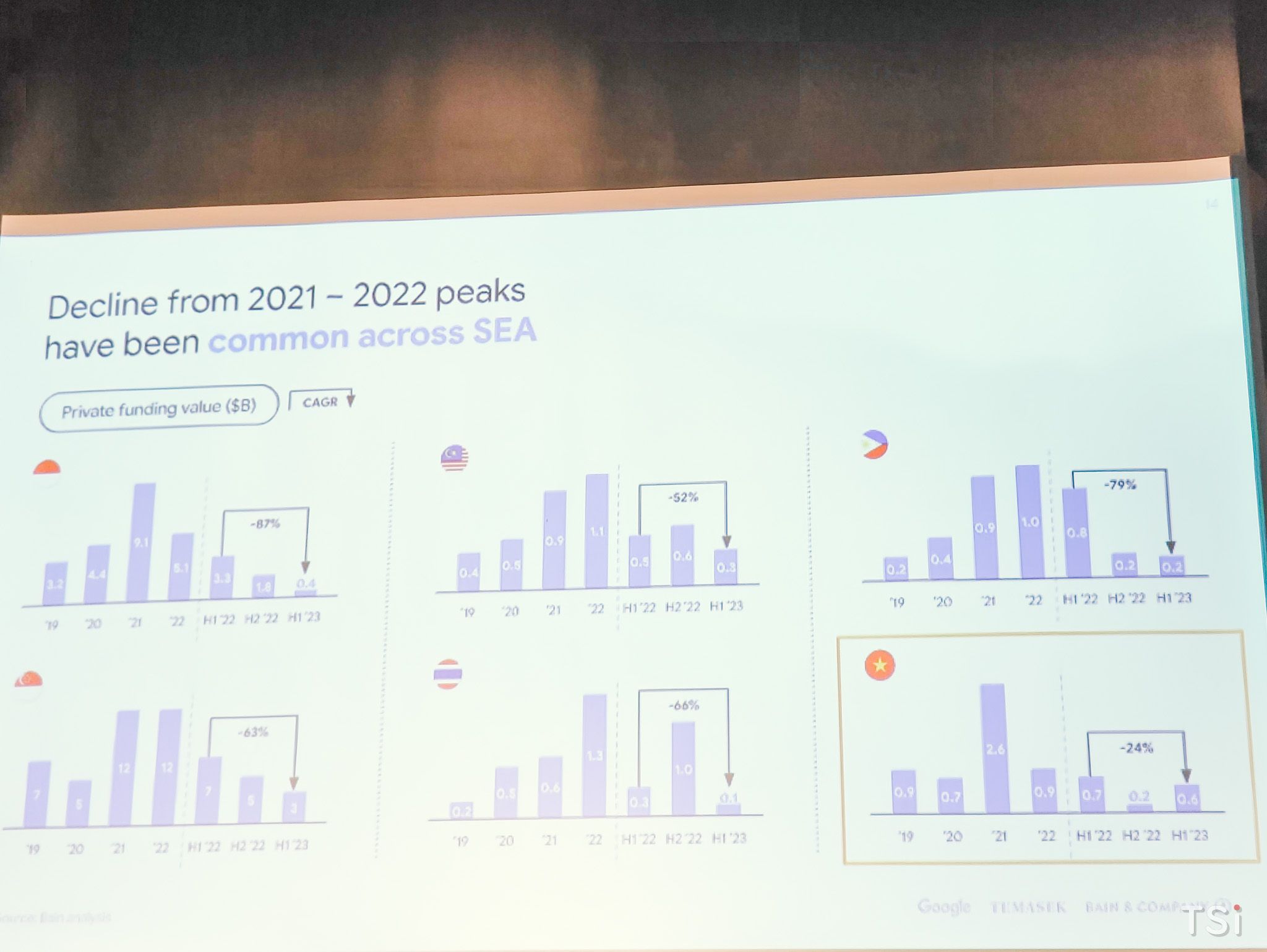 Những vấn đề này bao gồm sự điều chỉnh rộng hơn về định giá so với mức kỷ lục trong năm 2021, sự bất cập xung quanh lộ trình sinh lời của một số công ty và thị trường vốn đầy thách thức khiến việc thoái vốn trở nên khó khăn hơn. Tuy nhiên, Việt Nam là thị trường duy nhất tại Đông Nam Á có mức đầu tư tăng trong nửa đầu năm 2023 so với nửa cuối năm 2022.