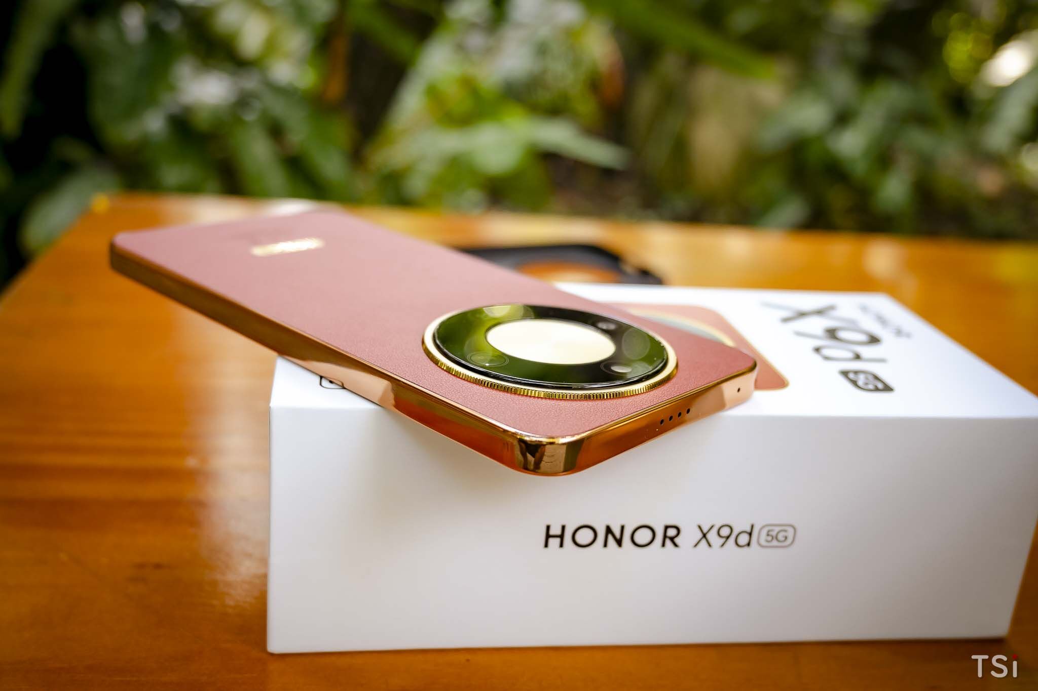 Thiết kế của HONOR X9d được hoàn thiện theo hướng cứng cáp nhưng vẫn giữ được tính thẩm mỹ. Phiên bản Sunrise Gold với phần lưng máy dùng chất liệu da nhân tạo, cụm camera dạng vòng tròn ở trung tâm tạo nhận diện quen thuộc của dòng X. Phần module camera này có độ nhô thấp đáng kể giúp mặt lưng liền mạch và bớt bị kênh khi đặt xuống mặt phẳng.