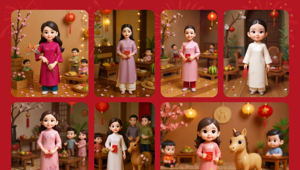 Câu lệnh gợi ý:“Sử dụng người trong bức ảnh làm tham chiếu khuôn mặt, tạo ra một mô hình chibi 3D trong bối cảnh Tết Việt Nam. Chỉ sử dụng đường nét khuôn mặt, tông da và kiểu tóc của người trong ảnh. Không sao chép quần áo hoặc phông nền gốc.