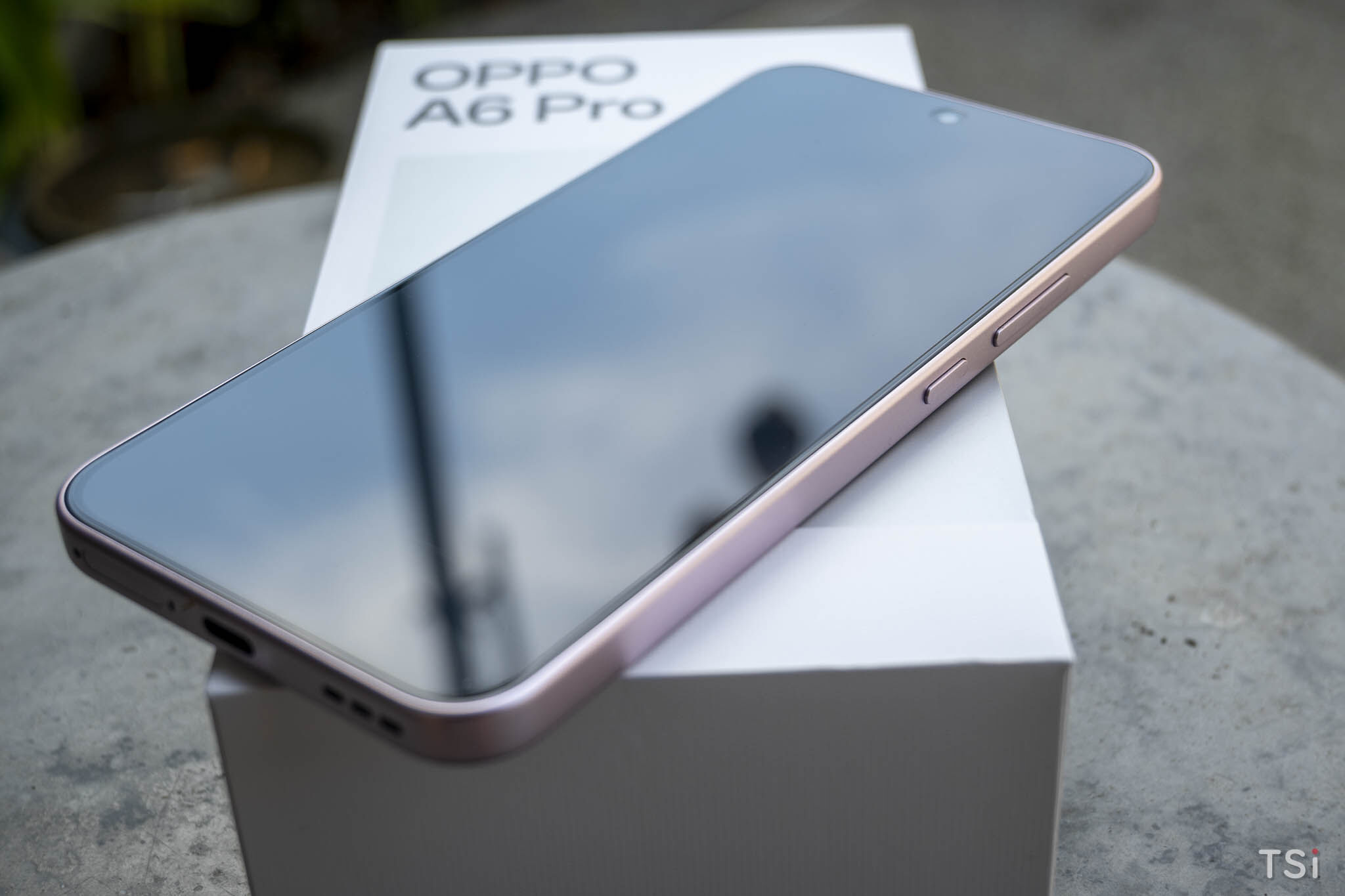 Về ngoại hình, OPPO A6 Pro sở hữu khung viền siêu mỏng, mặt lưng hoàn thiện dạng mờ giúp hạn chế bám vân tay. Phiên bản mình cầm có màu Hồng Thạch Anh, với họa tiết trông như một ngọn lửa. Dù pin lớn nhưng máy vẫn giữ được trọng lượng chỉ khoảng 188 g, mang lại cảm giác cầm nắm thoải mái.