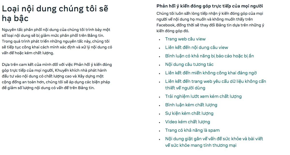 Facebook cho biết sẽ tiếp tục cập nhật Nguyên tắc phân phối nội dung, nhằm cung cấp thông tin minh bạch về cách hãng xác định và xử lý nội dung có vấn đề hoặc chất lượng thấp nhưng không vi phạm Tiêu chuẩn cộng đồng.