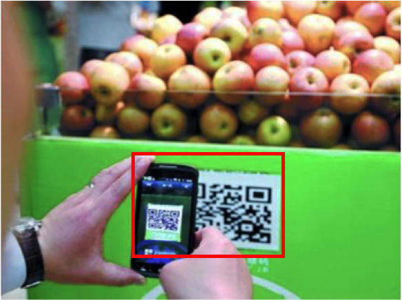Như hình dưới, người dùng QR code ở điện thoại như phù hiệu để vào khu tự phục vụ ở cửa hàng bán lẻ. QR code ở đây dùng như một chứng mình và kiêm luôn cả thanh toán. Vậy nên khi người dùng rời cửa hàng, tiền mua hàng sẽ tự động được thanh toán.
