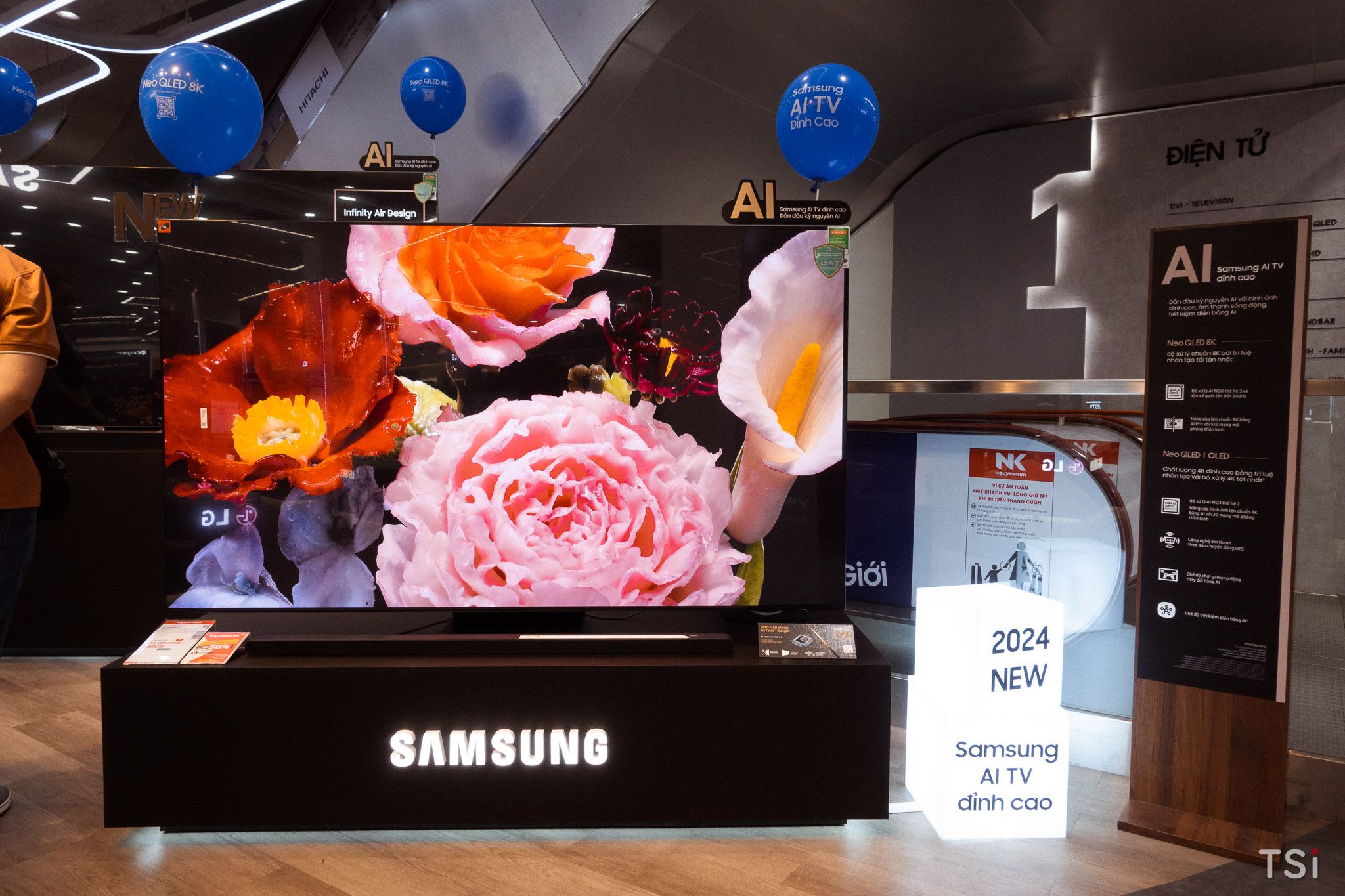 Thế hệ Samsung AI TV của năm 2024 ngoài những cải tiến vượt trội về chất lượng hình ảnh, âm thanh tinh chỉnh bởi AI còn có tính năng bảo mật Samsung Knox, và tiết kiệm điện bằng AI. Khu trưng bày TV của Samsung được bố trí ở vị trí rất bắt mắt với các dòng TV tích hợp AI mới nhất của hãng.