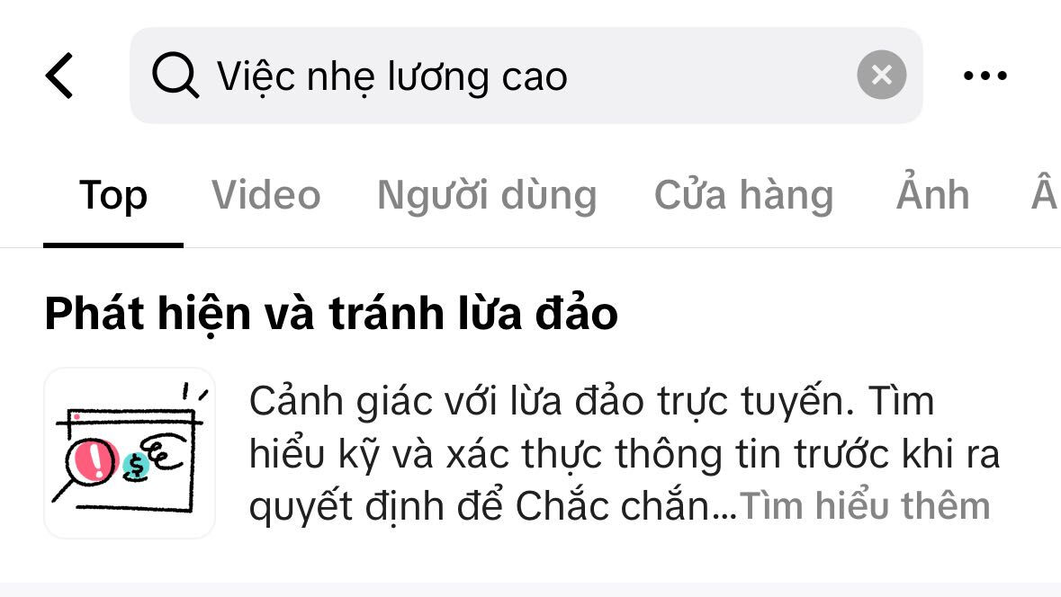 - Cảnh báo trên thanh tìm kiếm: Khi người dùng chủ động nhập các từ khoá có liên quan vào thanh tìm kiếm trên nền tảng, chẳng hạn như: việc nhẹ lương cao, nhận quà 0 đồng, link nhận thưởng, tuyển dụng gấp, người yêu online… TikTok sẽ hiển thị thông báo cảnh báo cùng đường dẫn đến trang H5 #LuaDaoTrucTuyen2025 – nơi tổng hợp các thông tin và hướng dẫn cách phòng chống lừa đảo trực tuyến từ các chuyên gia và các nhà sáng tạo nội dung trên TikTok.