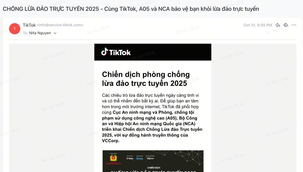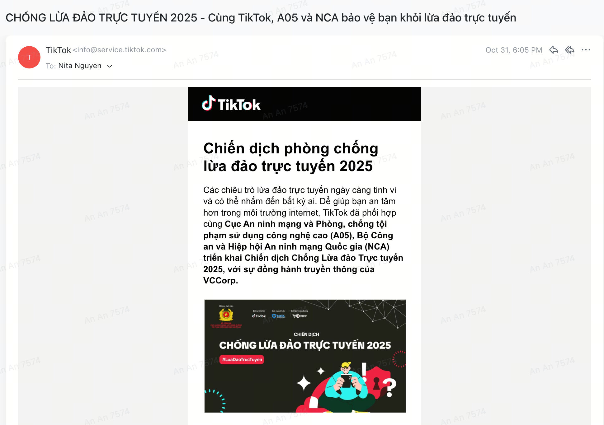Đầu tháng 10/2025, nền tảng TikTok phối hợp cùng Cục An ninh mạng và Phòng, chống tội phạm sử dụng công nghệ cao (A05 – Bộ Công An) và Hiệp hội An ninh mạng Quốc gia (NCA) khởi động chiến dịch “Phòng chống lừa đảo trực tuyến 2025”, hướng đến việc nâng cao nhận thức cộng đồng về an toàn mạng, giúp người dùng nhận biết và phòng tránh các hình thức lừa đảo trực tuyến ngày càng tinh vi.