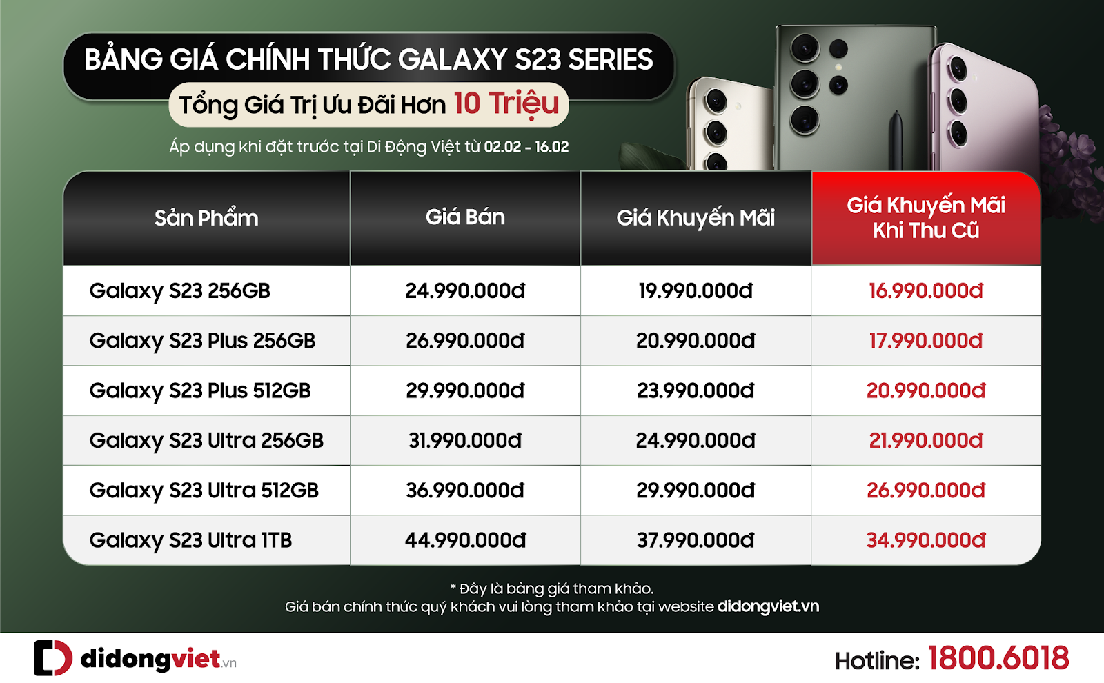 Hiện tại, Galaxy S23 series đang có mức giá từ 24,99 triệu đồng cho phiên bản S23 dung lượng 256GB. Galaxy S23 Plus và Ultra có giá lần lượt là 26,99 triệu đồng và 31,99 triệu đồng. Từ ngày 2 – 16/2, khi đặt trước Galaxy S23 series tại Di Động Việt, người dùng sẽ nhận những ưu đãi trừ trực tiếp vào giá sản phẩm như phiếu mua hàng trị giá đến 5 triệu đồng, tặng thêm đến 5 triệu đồng khi thu cũ đổi mới và giảm thêm 2 triệu đồng khi thanh toán qua thẻ ngân hàng.
