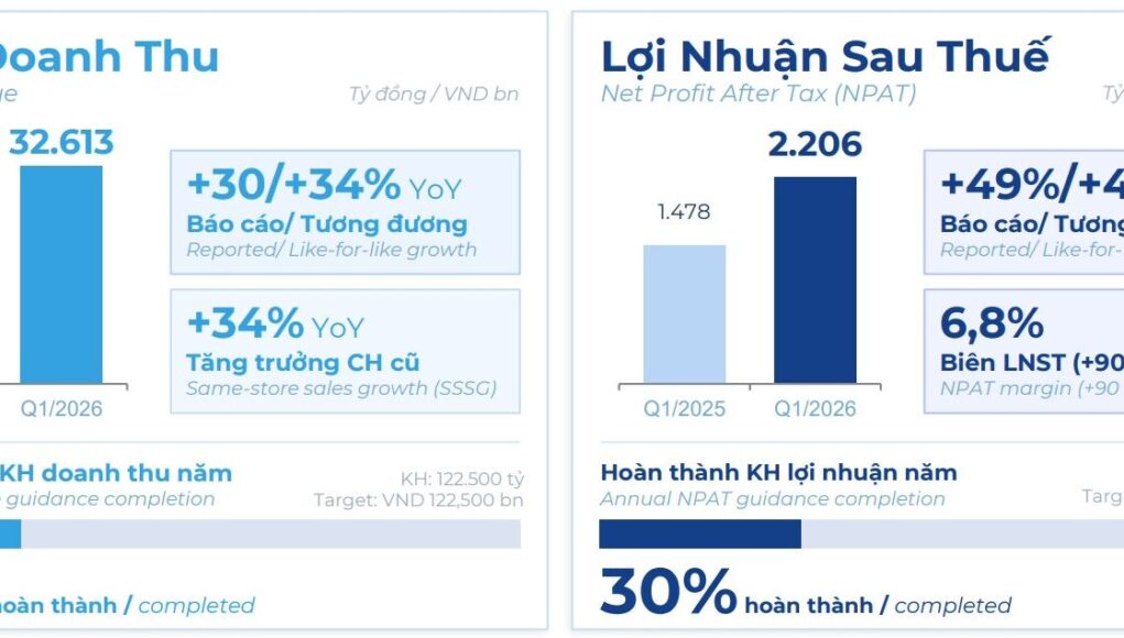 Điện Máy Xanh (DMX) vừa công bố kết quả kinh doanh quý I/2026 với mức tăng trưởng khả quan. Doanh thu thuần đạt 32.613 tỷ đồng, tăng 30% so với cùng kỳ, trong khi lợi nhuận sau thuế đạt 2.206 tỷ đồng, tăng 49%. Qua đó, doanh nghiệp đã hoàn thành khoảng 26% kế hoạch doanh thu và 30% mục tiêu lợi nhuận năm ngay trong quý đầu tiên.