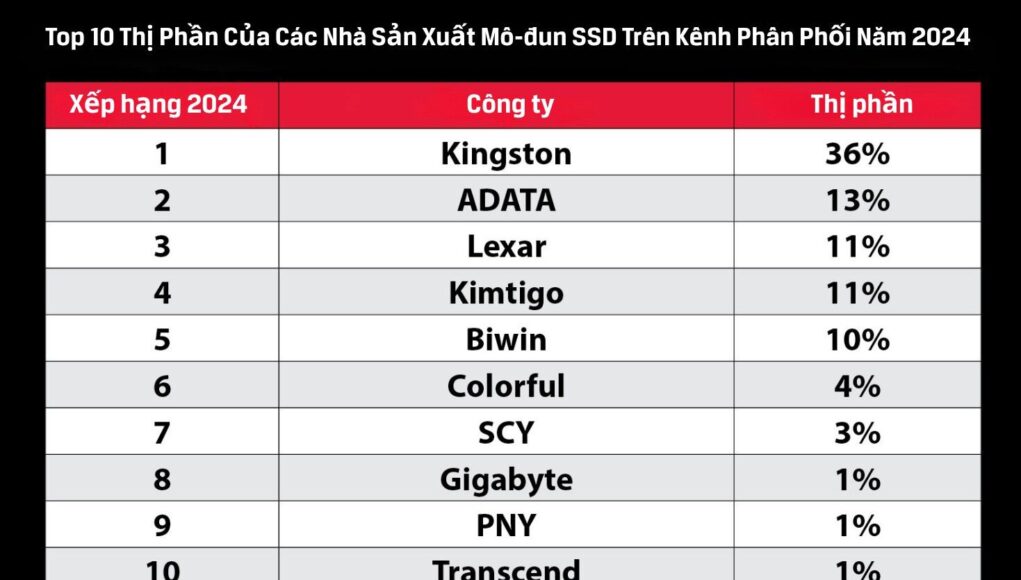 Theo số liệu ấn tượng do TrendForce cung cấp, Kingston chiếm 36% trong tổng số sản phẩm SSD được xuất xưởng trên toàn cầu vào năm 2024.