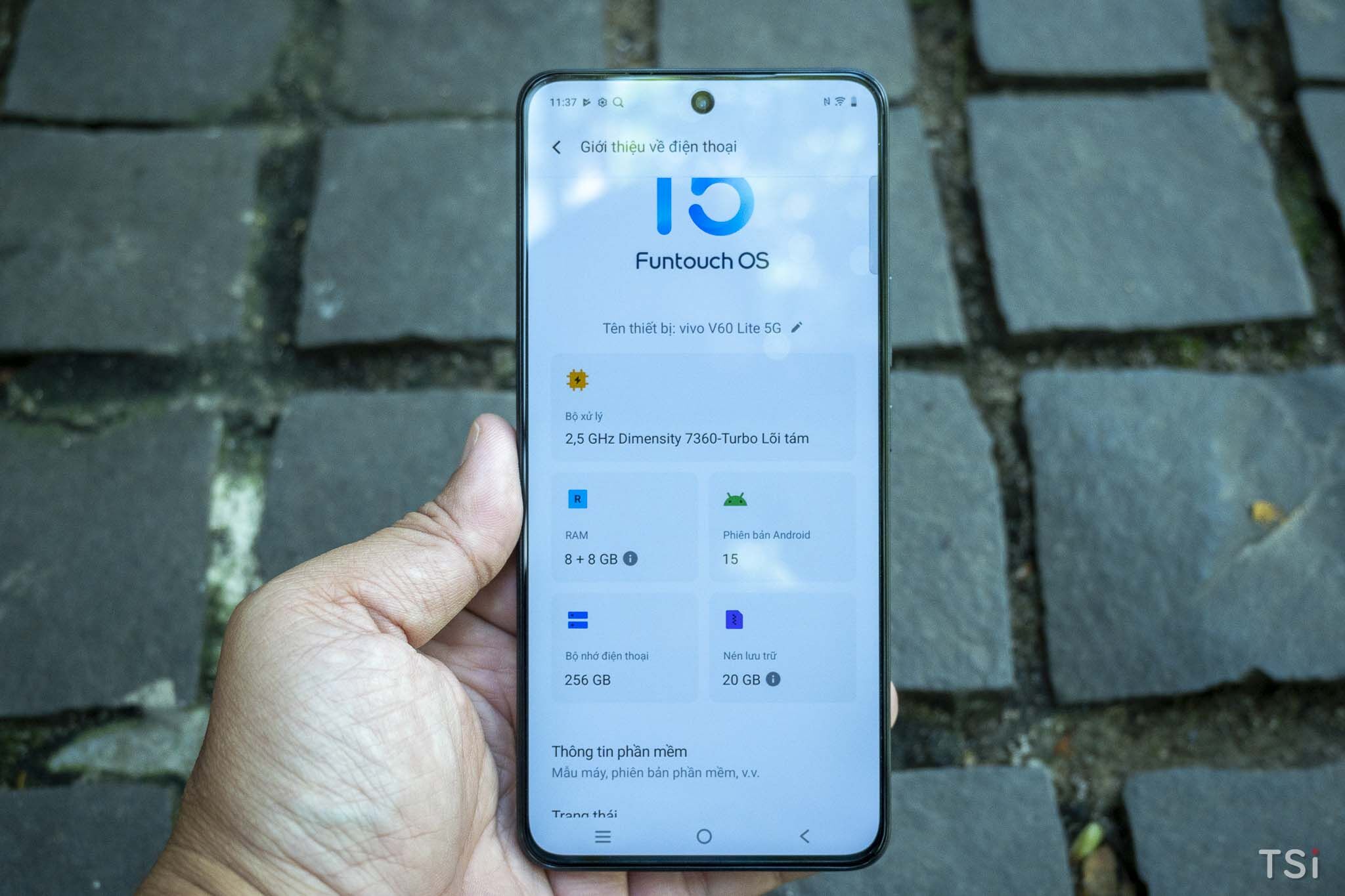 Về hiệu năng, vivo V60 Lite 5G được trang bị chip MediaTek Dimensity 7360 Turbo, RAM 8 GB và bộ nhớ lưu trữ 256 GB, hỗ trợ mở rộng RAM ảo lên tới 12 GB. Thử dùng GeekBench 6 cho điểm đơn nhân là 1011 và đa nhân là 2856, cao hơn chip Snapdragon 860 và Exynos 1380 ở điểm số. Chơi game Liên Quân Mobile máy duy trì được 60fps ở thiết lập cao sau khoảng 1 giờ chơi liên tục, nhiệt lượng tỏa ra vừa phải và không gây cảm giác khó chịu.