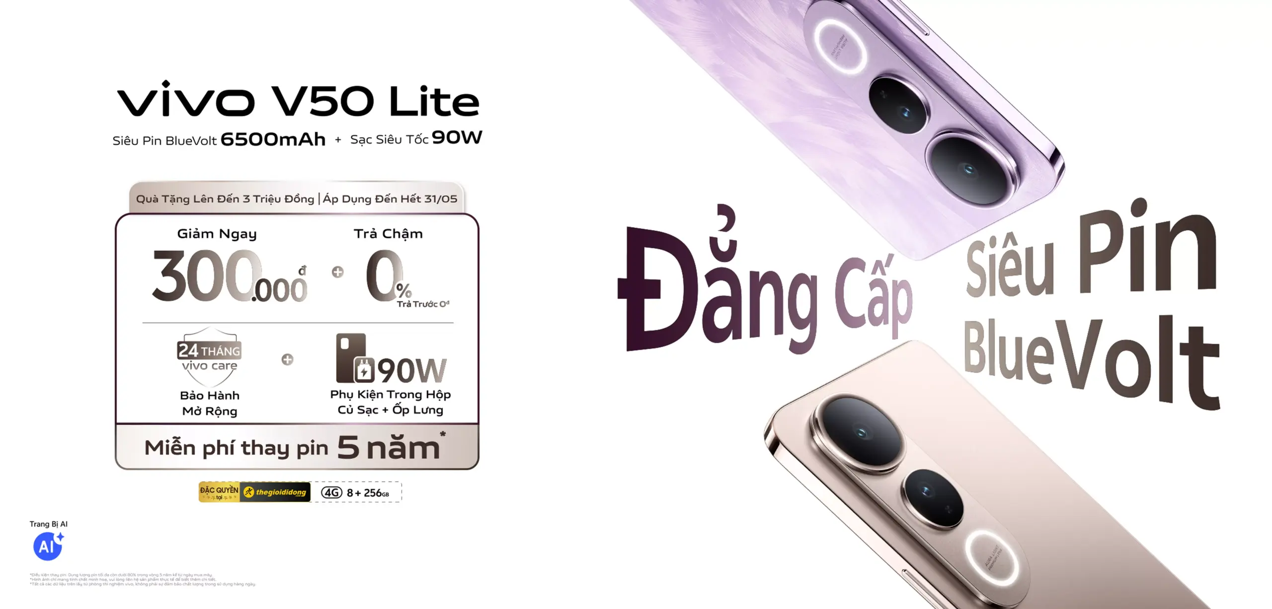 Dòng V Lite luôn nổi bật với chính sách miễn phí thay pin độc quyền từ vivo: 4 năm đối với V40 Lite và 5 năm đối với V50 Lite, thể hiện cam kết đồng hành lâu dài của vivo cùng người dùng trong suốt vòng đời sản phẩm. Cụ thể, nếu dung lượng pin tối đa giảm xuống dưới 80% trong vòng 5 năm kể từ ngày mua, khách hàng sẽ được thay pin hoàn toàn miễn phí. Đây là lời khẳng định mạnh mẽ của vivo về chất lượng và độ bền sản phẩm, giúp người dùng hoàn toàn an tâm, thoải mái sử dụng mà không còn phải lo ngại về vấn đề chai pin.
