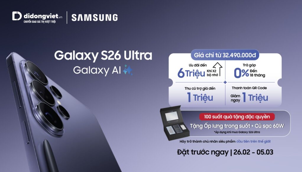 Từ ngày 26.02 đến 05.03, khách hàng đã có thể đặt hàng trước Samsung Galaxy S26 series tại hệ thống Di Động Việt với nhiều ưu đãi hấp dẫn. “Siêu phẩm” gây ấn tượng nhờ thiết kế mới, camera “mắt thần bóng đêm” và tính năng chống nhìn trộm đột phá.