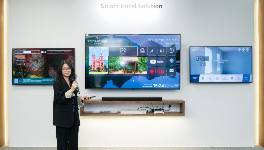 Đối với lĩnh vực khách sạn, LG cung cấp các giải pháp Hotel TV giúp biến không gian phòng nghỉ thành trải nghiệm giải trí chuẩn 5 sao. Sản phẩm được trang bị lớp phủ chống ăn mòn bo mạch (phù hợp với đặc thù khí hậu tại Việt Nam), hỗ trợ quản lý nội dung tập trung và tùy biến giao diện chào mừng. Đặc biệt, tính năng tự động xóa dữ liệu sau khi trả phòng giúp đảm bảo tuyệt đối quyền riêng tư cho du khách.