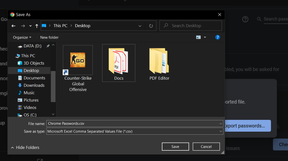 - Nhấp vào Export Password và lưu mật khẩu dưới dạng tập tin CSV trên ổ đĩa.