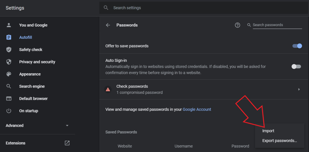 - Chọn tất cả mật khẩu đã lưu và nhấn Import.