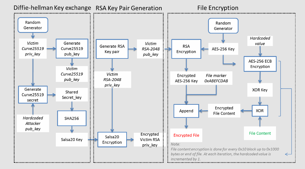 Theo Fortinet, chủng DeathRansom mới sử dụng kết hợp thuật toán Curve25519 cho sơ đồ trao đổi khóa Elliptic Curve Diffie-Hellman (ECDH), Salsa20, RSA-2048, AES-256 ECB và thuật toán XOR dạng khối đơn giản để mã hóa các tập tin như hình dưới đây.