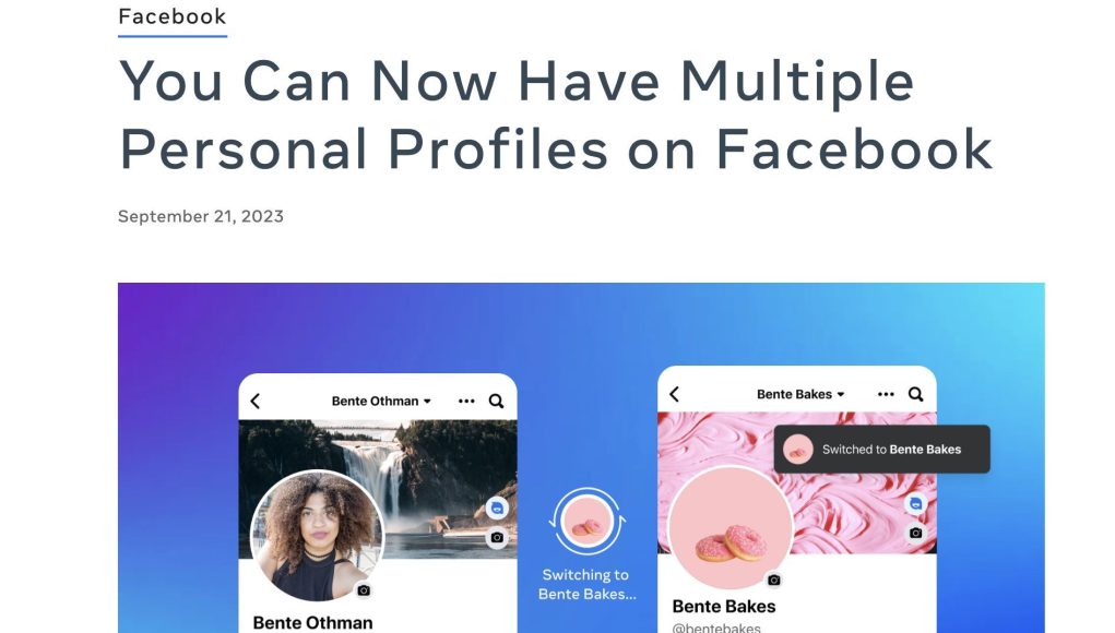 Người dùng hiện được tạo tối đa 4 hồ sơ cá nhân bổ sung bằng một tài khoản Facebook. Việc chuyển đổi hồ sơ sẽ hoạt động giống như trên Instagram, không cần đăng nhập hoặc đăng xuất.