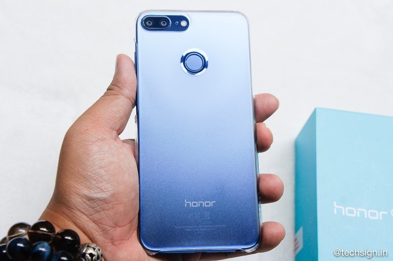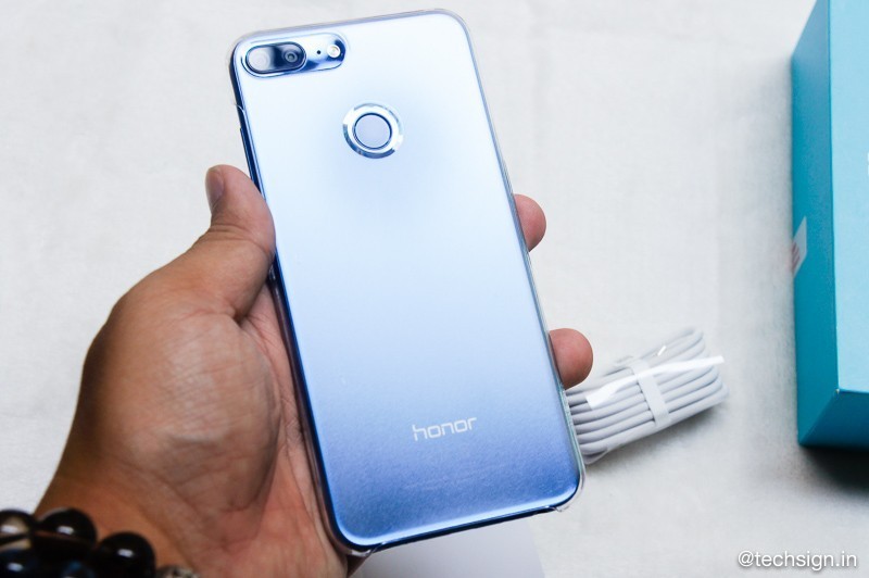 Mặt sau máy với góc trên phía trái là khu vực camera kép hơi lồi một chút, trong khi đèn LED Flash nằm dưới mặt kính, cảm biến vân tay đặt ở phía chính giữa hơi lõm vào trong, giúp dễ dàng định vị trí bằng ngón tay để xác thực. Vì mặt lưng hoàn toàn bằng kính nên việc bám vân tay là điều tất yếu, Honor có tặng kèm một ốp nhựa cứng trong suốt, nhưng song song với việc cầm nắm chắc thì nó cũng làm cho máy bị mất đi vẻ đẹp.