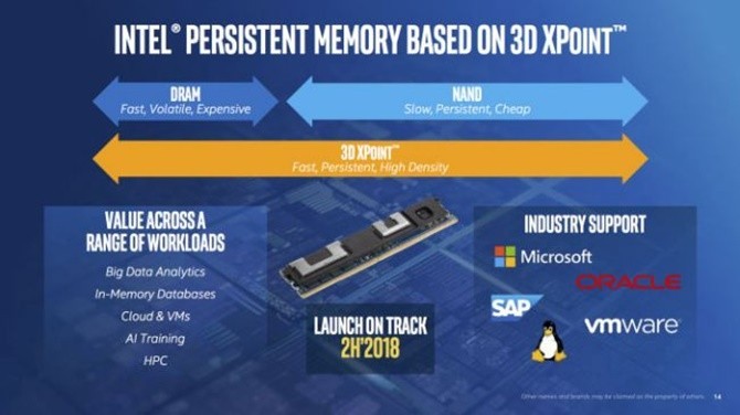 Theo PCgamer, tại hội nghị USB Global Technology Conference hôm thứ Ba vừa qua, Intel đã chia sẻ một lộ trình được cập nhật cho thấy công ty đang chuẩn bị phát hành RAM Optane DIMM vào nửa cuối năm 2018.