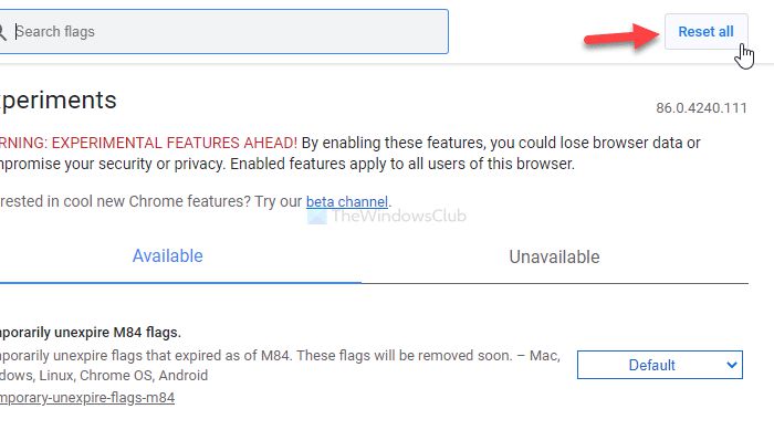 - Chọn Reset all để đặt lại tất cả cài đặt Chrome Flags.