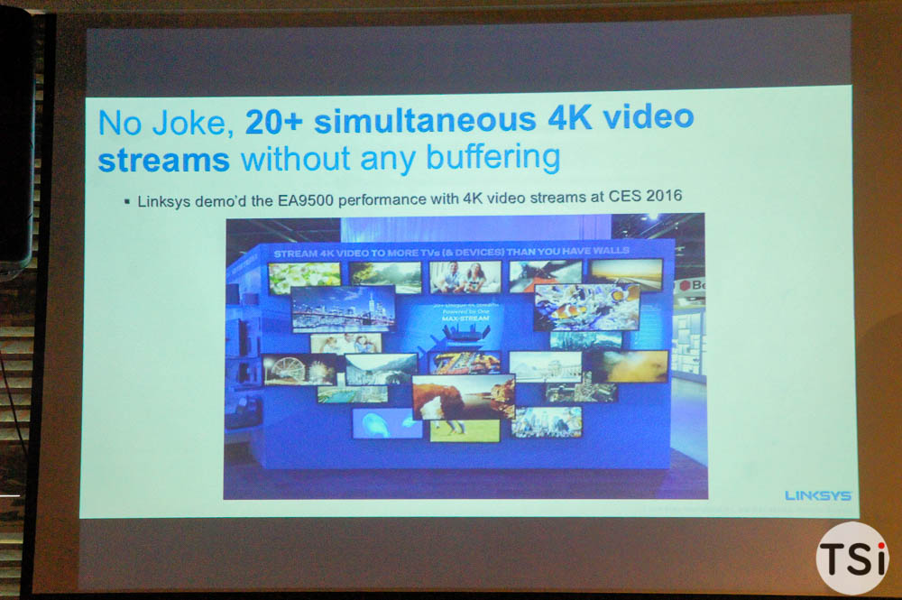 Đạt giải thưởng Hệ thống mạng Tốt nhất thế giới của CES 2016, Linksys EA9500 được trang bị công nghệ Wi-Fi AC thế hệ thứ 2, MU-MIMO, 3 băng tần và 8 anten ngoài công suất lớn, mang đến mạng Wi-Fi mạnh mẽ với tốc độ kết hợp lên đến 5.3 Gbps. Sản phẩm có thể cung cấp cùng lúc 8 luồng truyền dữ liệu không dây có kích hoạt MU-MIMO, giúp mọi người trong gia đình có thể kết nối Wi-Fi để chơi game, nghe nhạc, gửi email, mua sắm, xem video trực tuyến chuẩn 4K…