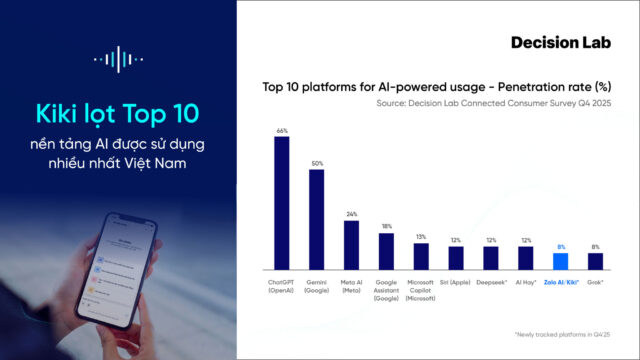 Theo báo cáo The Connected Consumer – Quý IV/2025 do Decision Lab công bố, Kiki Info là một trong những nền tảng AI được sử dụng phổ biến nhất tại Việt Nam, xuất hiện trong bảng xếp hạng cùng các tên tuổi toàn cầu như ChatGPT, Gemini, Copilot, Deepseek hay Grok.