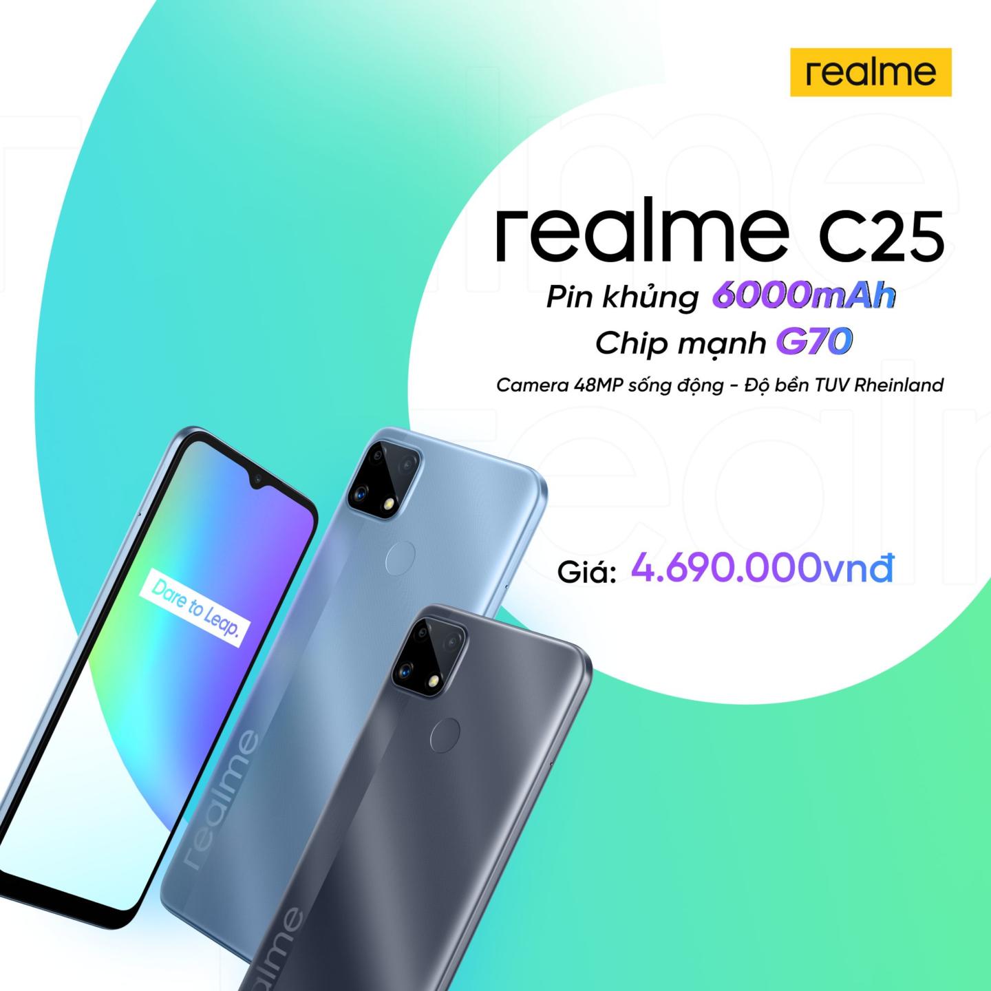 Theo đó, realme C25 trang bị chipset MediaTek Helio G70, pin khủng 6000mAh, màn hình giọt sương cải tiến 6,5 inch, bộ ba camera AI 48MP, hỗ trợ sạc nhanh 18W với cáp sạc USB Type-C. Sản phẩm được mở bán vào ngày 17/04/2021 với phiên bản 4GB RAM và 128GB ROM và mức giá 4,69 triệu đồng. Riêng trong 2 ngày đầu mở bán (17-18/4), khách hàng mua realme C25 sẽ được giảm ngay 300.000VND.