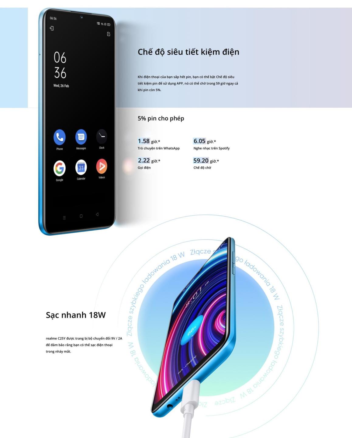 Về dung lượng, realme C25Y tiếp tục củng cố danh tiếng pin “trâu” của mình bằng viên pin lên tới 5.000 mAh, có thể trụ vững 48 ngày ở chế độ chờ. Nếu chuyển sang chế độ “Siêu tiết kiệm pin”, bạn vẫn có thể thoải mái lướt nhiều ứng dụng trên smartphone ngay cả khi năng lượng xuống ở mức rất thấp.