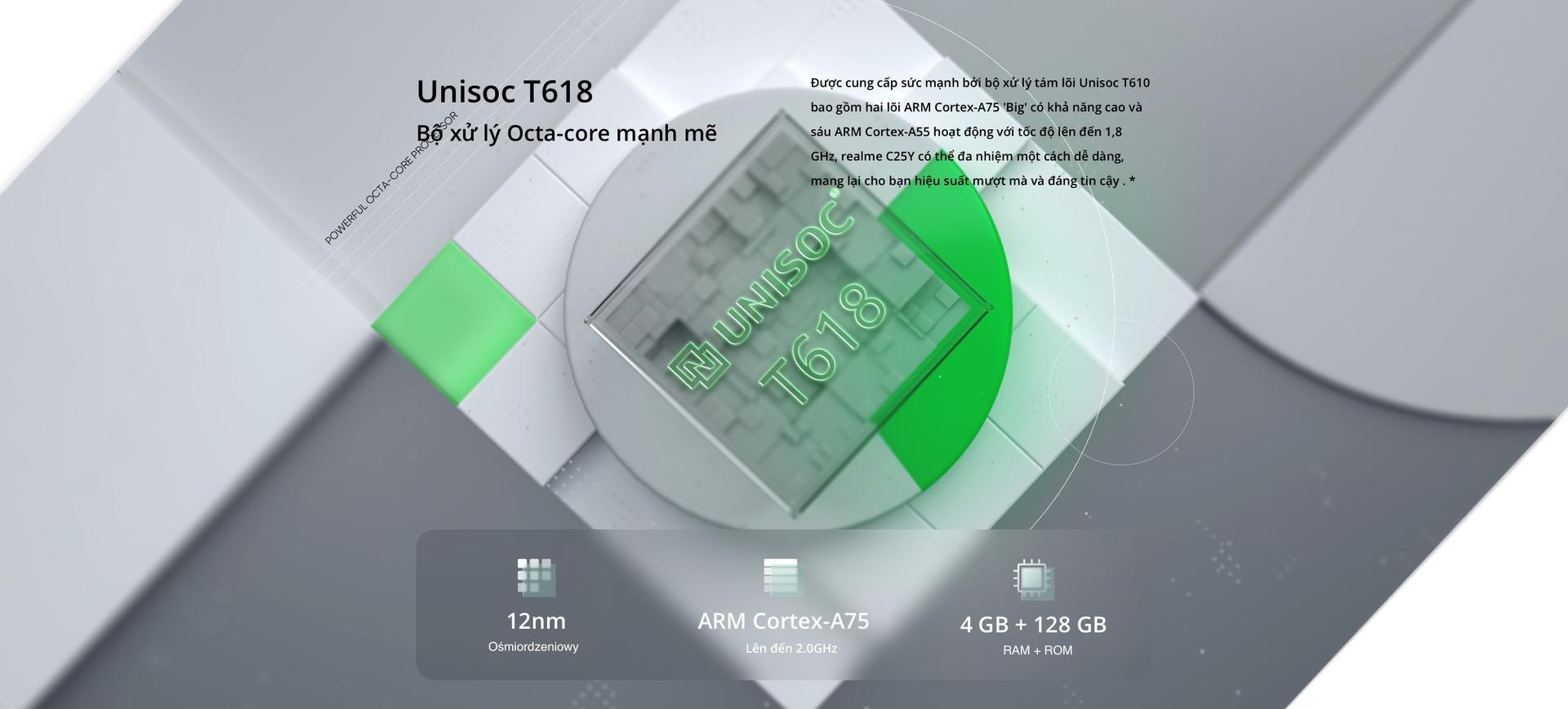 Nổi trội hơn “anh bạn” realme Narzo 50i, dòng smartphone realme C25Y “bỏ túi” những điểm cộng đáng mơ ước để trở thành “ngôi sao sáng” giữa những sản phẩm cùng phân khúc. Chiếc C25Y được trang bị bộ vi xử lý 8 nhân 12nm Unisoc T618, bao gồm 2 nhân Arm Cortex-A75 và 6 nhân Arm Cortex-A55, có tốc độ lên đến 2.0GHz. Mọi hoạt động của bạn trên chiếc smartphone giờ đây đều được realme C25Y thực hiện nhanh hơn, mượt hơn. Bên cạnh đó, GPU ARM Mali G52 với tốc độ xung nhịp 614,4MHz cho khả năng hiển thị đồ họa sống động không thua gì những dòng smartphone cao cấp.