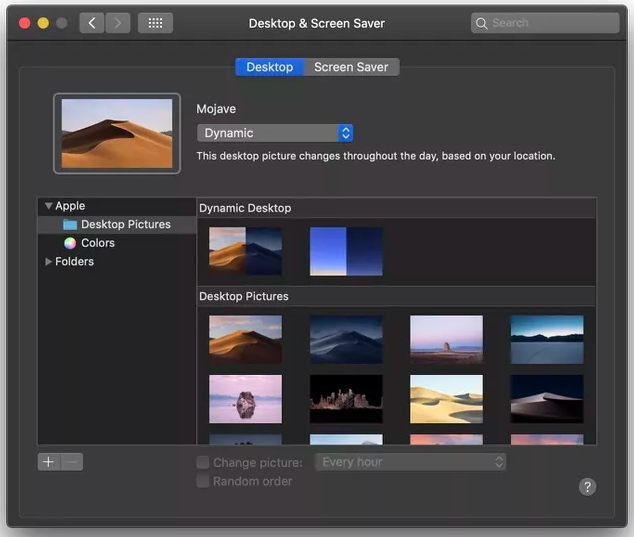 Với Mojave của MacOS, Apple giới thiệu hình nền động thay đổi ánh sáng chậm rãi, từ cảnh sáng, sa mạc nắng cho đến mát hoặc tối. Để kích hoạt cho MacBook mới của mình, bạn vào System Preferences > Desktop & Screen Saver. Có hai chế độ là Mojave và Solar Gradients.