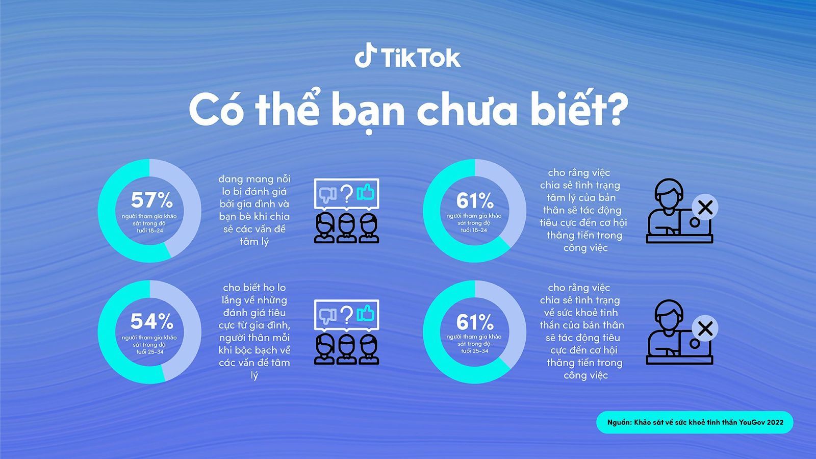 Khảo sát của TikTok và YouGov cũng cho thấy 77% người tham gia cảm thấy thoải mái khi chia sẻ những khó khăn về sức khỏe tinh thần nếu người thân yêu của họ cởi mở hoặc 34% sẵn sàng giãi bày các vấn đề về sức khoẻ tinh thần của bản thân nếu các thông tin liên quan được cung cấp miễn phí trên các nền tảng nội dung số.